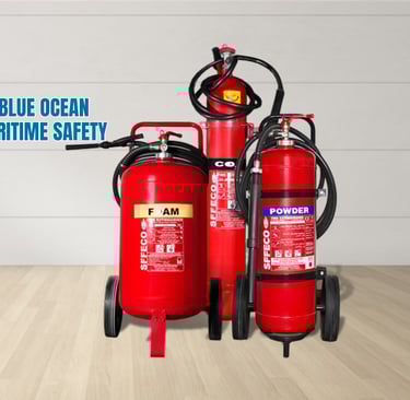 Mobile fire extinguishers are high-capacity units mounted on wheels, allowing easy transportation to fire locations onboard. They are suitable for engine rooms, cargo spaces, and high-risk areas. These units provide extended firefighting capability and are required on certain vessel types under SOLAS fire safety requirements.